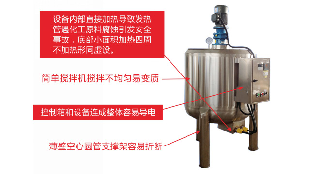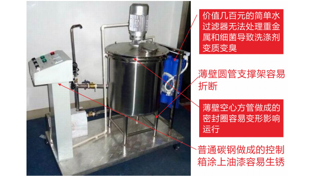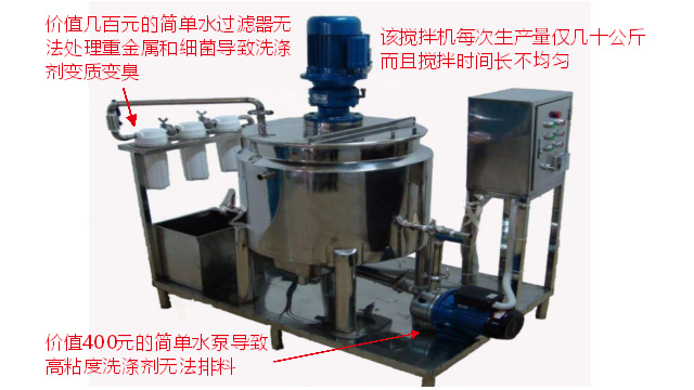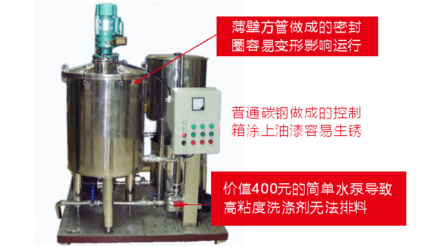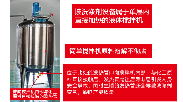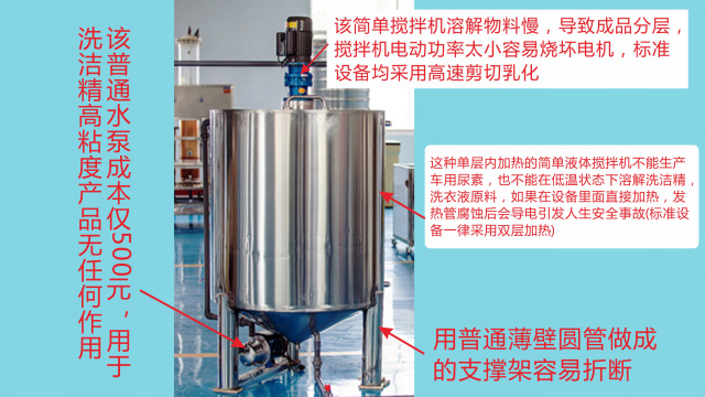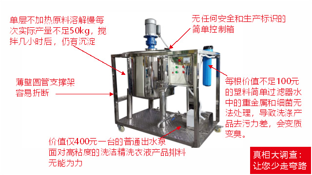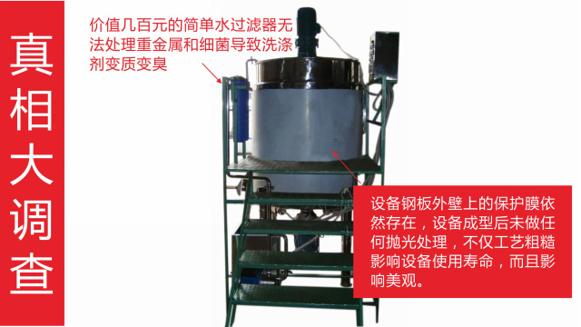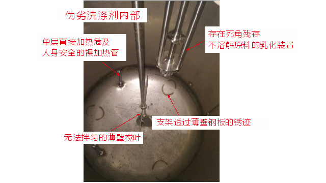 五、項(xiàng)目加盟騙局提供的洗潔精設(shè)備、洗衣液設(shè)備,大都是單層不加熱或單層攪拌機(jī)內(nèi)部用發(fā)熱管直接加熱,當(dāng)燒堿、尿素、磺酸等化工原料長(zhǎng)期接觸設(shè)備內(nèi)部的發(fā)熱管后就會(huì)腐蝕,腐蝕后的的銹斑首先會(huì)導(dǎo)致洗滌產(chǎn)品和車用尿素重金屬增加及產(chǎn)品外觀顏色渾濁,還會(huì)引起產(chǎn)品中細(xì)菌滋生變質(zhì)變臭,更嚴(yán)重的是攪拌機(jī)內(nèi)部的發(fā)熱管腐蝕后導(dǎo)電引發(fā)人身安全危機(jī);