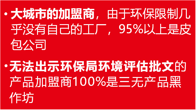 二、加盟騙局實(shí)施者雖有營(yíng)業(yè)執(zhí)照和常規(guī)手續(xù),但沒有環(huán)保局頒發(fā)的的項(xiàng)目環(huán)評(píng)報(bào)告書,實(shí)際上就是一個(gè)沒有實(shí)體工廠的皮包公司;