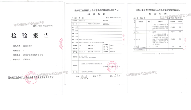 富達日化生產(chǎn)的玻璃水設備,主要包含水處理設備、水計量設備、反應釜、灌裝機等組成符合生產(chǎn)國家標準的玻璃水。為用戶提供中、高、低檔玻璃水配方,提供包裝、原料、辦廠證件,聯(lián)營辦廠,讓您銷售無憂。2017年2月,由公司自主研發(fā)的玻璃水配方生產(chǎn)的相思竹玻璃清洗劑送到國家輕工業(yè)香料化妝品洗滌用品質(zhì)量監(jiān)督檢測武漢站檢測,根據(jù)GB9985—2000 QB/T 4086-2010《玻璃清洗劑》等檢測依據(jù),送檢的產(chǎn)品符合標準要求。