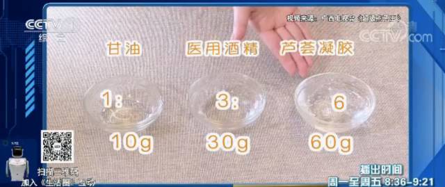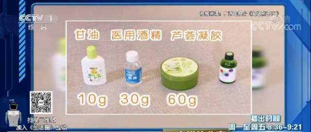 小貼士:95%的醫(yī)用酒精和甘油及蘆薈凝膠混合在一起,會稀釋酒精的濃度,再用來洗手就不會傷皮膚了。